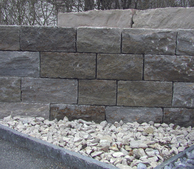 Gestaltungssteine/Quadersteine: lose. Ansichtsfläche gespalten, Lager naturbelassen. Kleinmauersteine allseitig gespalten. Auf Wunsch gefräste Fugen. Mauersteine handgerichtet: gesägte Lagerflächen, Vorderkante gespalten, teilweise getrommelt, Köpfe gesägt oder gespalten.